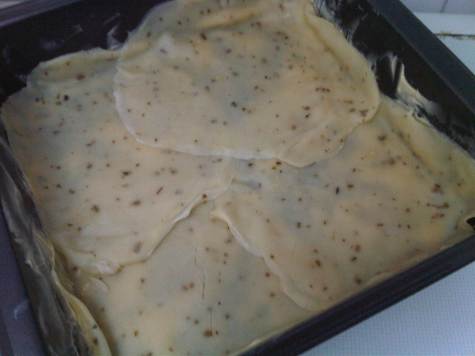 - Buttered the 20cm x 20cm baking dish and place the crepe pasta on the bottom part.