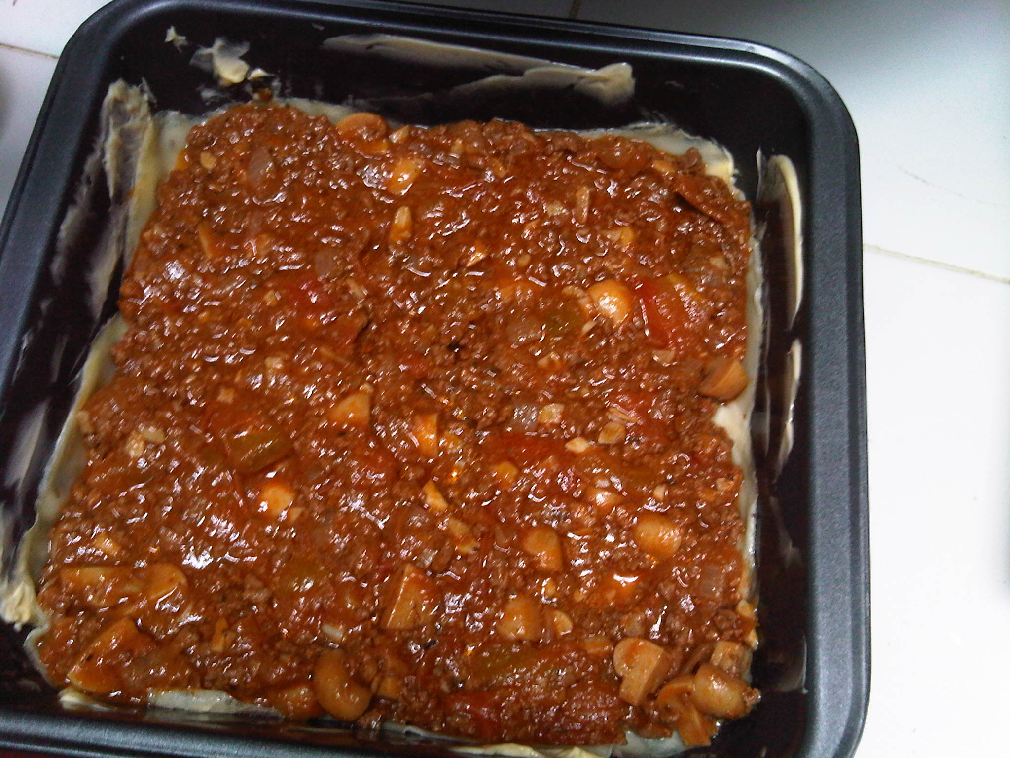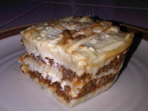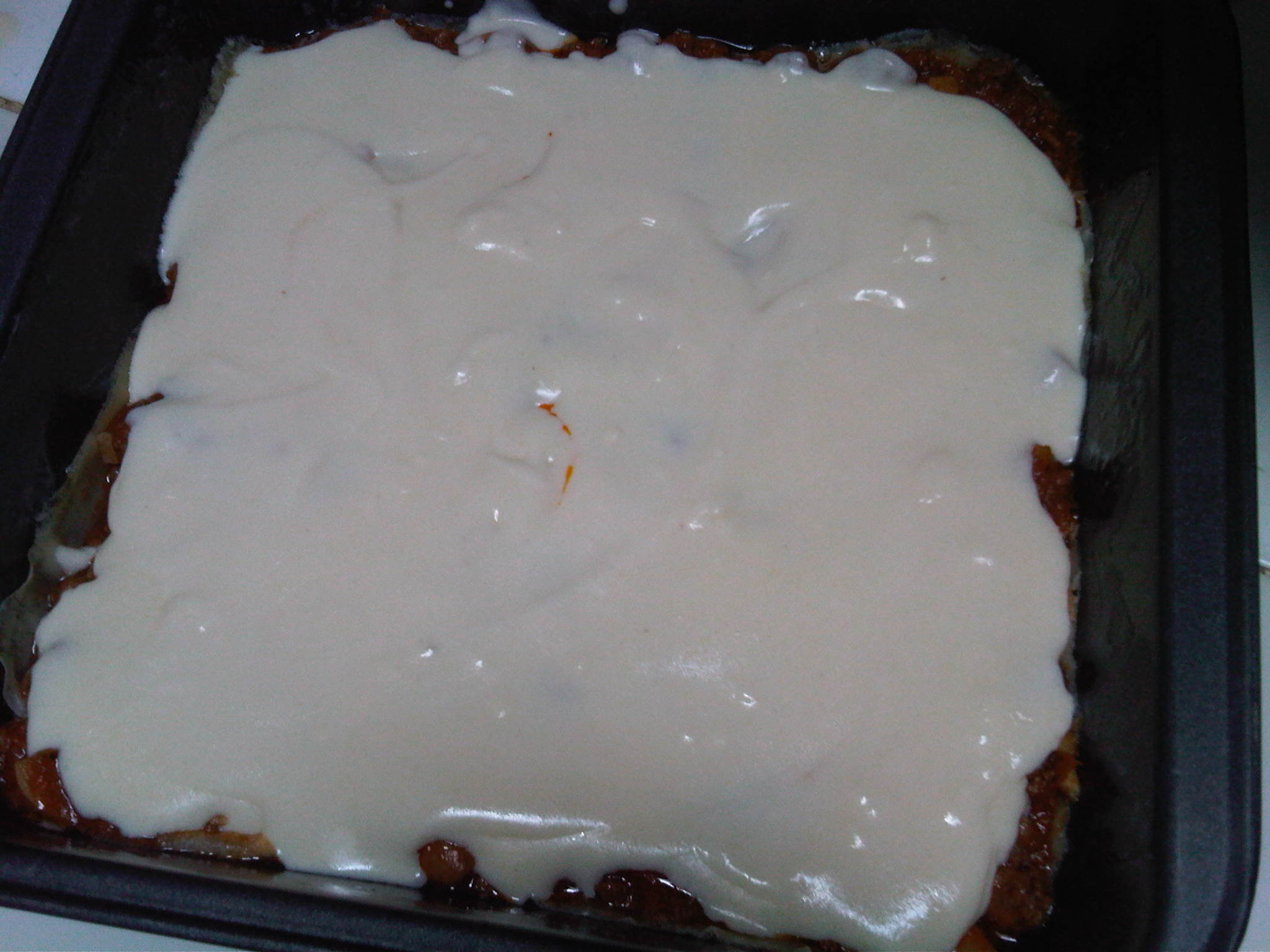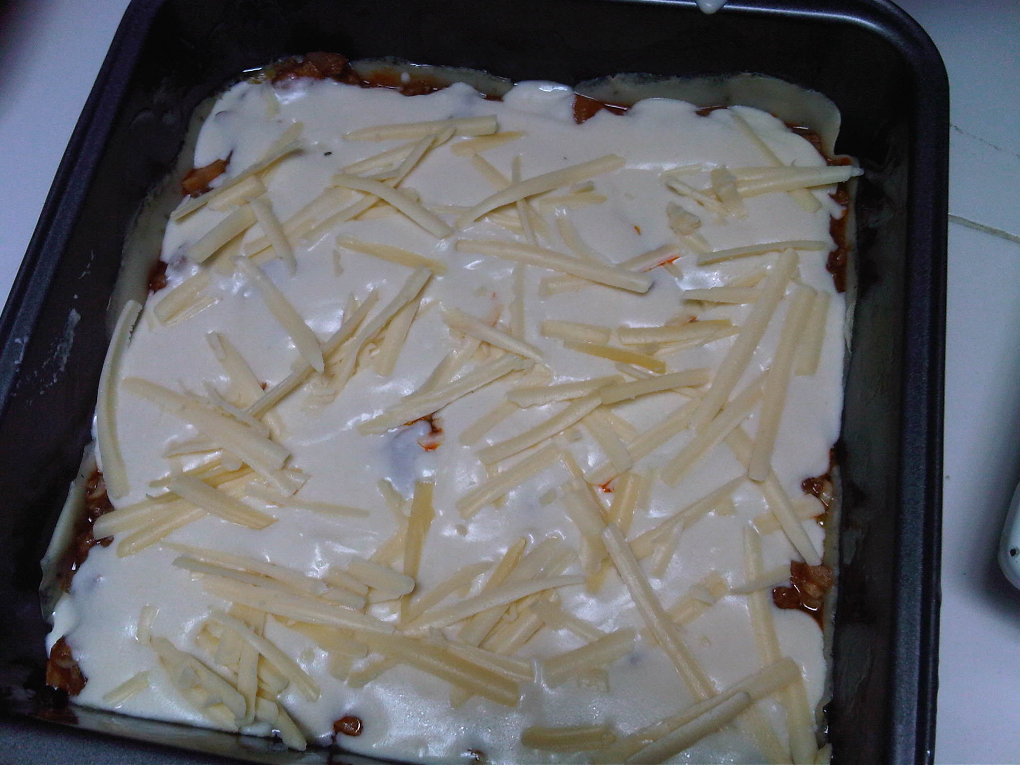 - Add a layer of beef bolognaise, then the bechamel sauce , then the gratted cheese. Put another layer of crepe pasta on top of it