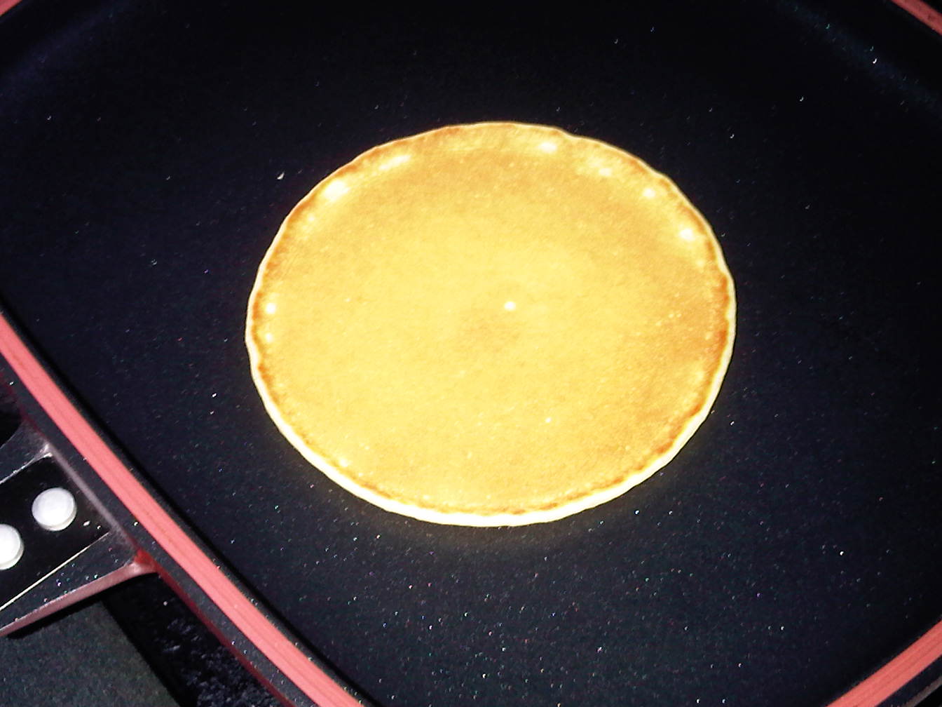 - pour the batter onto pan, about 1/4 cup, brown on both sides. serves hot with butter and maple syrup.