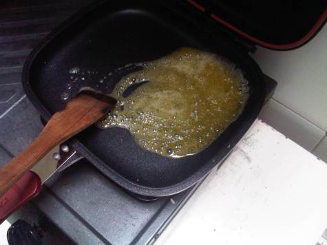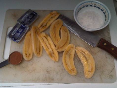 - put the bananas on the pan, face down on the flat side. Sprinkles the sugar and cinnamon on top of it.