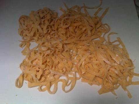Roll and cut the dough into fettuccine shape, dust with flour and set aside.