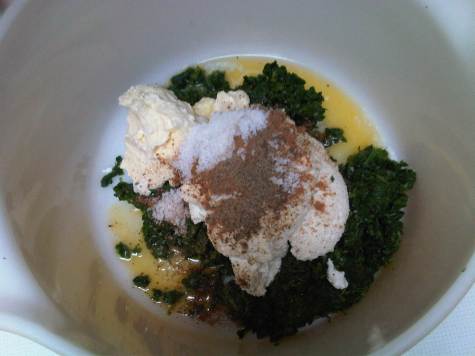 - In a mixing bowl, combine chopped spinach, ricotta, egg, creme fraiche, and 4 tablespoons grated cheese. Season with the nutmeg, salt, and black pepper.