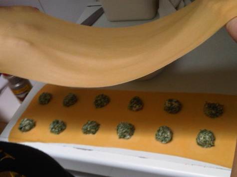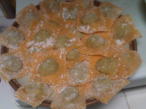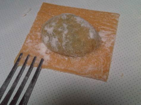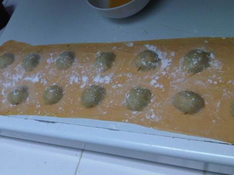 - Set aside each ravioli on a plate lightly dusted with flour. Do not stack the raviolis, because they will stick together. I stacked them.. sorry :p but in my defense, I cooked them right away!