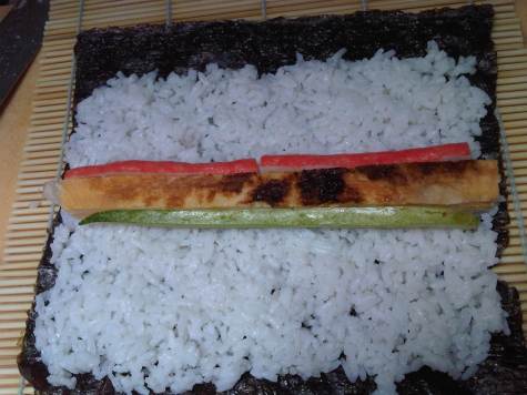 - place a sheet of nori on the bamboo mat. Spread the rice thinly on top of the nori, leaving an inch of nori on one of the edge. Remember to keep your hand wet with vinegar water. *important, it’s to keep your hand sterile as well, not just to prevent sticking*