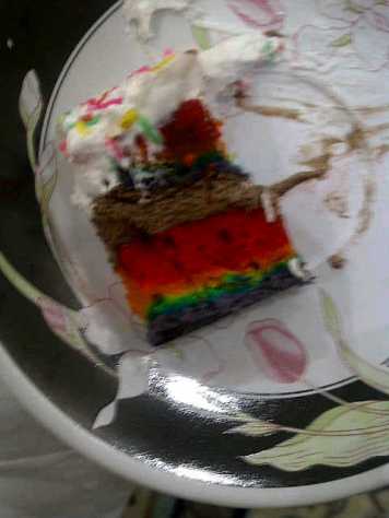 Now, sily me I forgot to take pictures of the cake before serving. but then I asked him to take photo of the cake after cutting. He send me this poorly shot photos. Boo.. But who am I to complain, miss-I-still-use-my-blackberry-camera-for-everything.