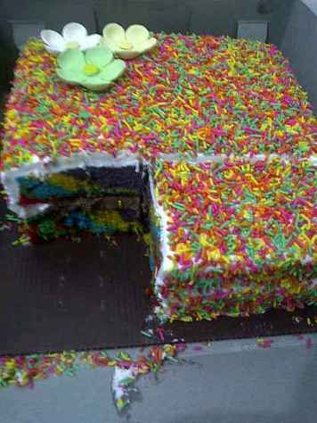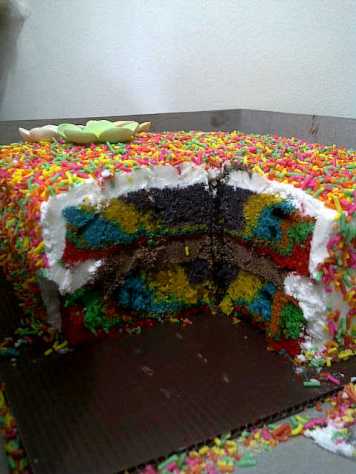 I made a TIE DYE CAKE for a birthday party of my friend. Actually it’s for his son’s 3rd birthday, but I kinda hate him for already having a son when he’s younger than me! How could he??? AND his wife just gave birth to their 2nd child!! WHATT?? *end rants*