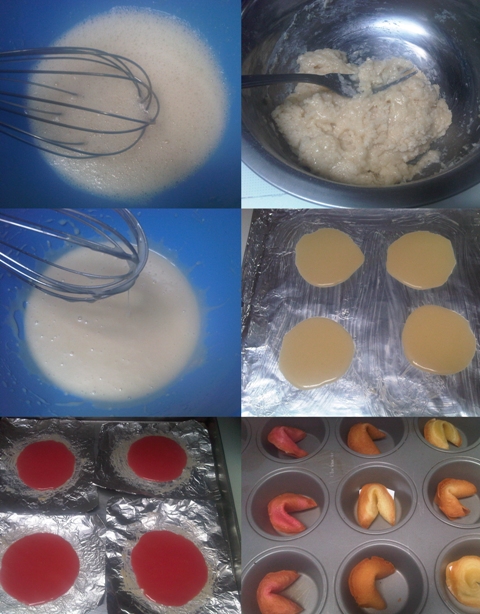 Tantangan pertama di tahun 2012 ini sukses bikin para baker menjadi ahli debus. Kesulitan dalam pembuatan fortune cookies bukan dari meracik adonan, tapi pada saat melipat ke dalam bentuk khasnya, tangan kosong dalam keadaan panas keluar dr oven! Makanya ya.. jadi pada berguru ilmu debus, hehehehe.