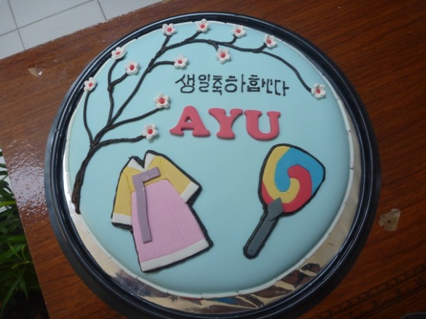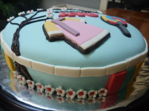 This was a cake ordered by my friend for his little sister who’s crazy for Korean culture. He wanted the cake to be Korean themed and left everything on my hand for the design. His only request was he wanted it to be tie dye cake filling. So I made this with the idea of a Korean traditional drum, with colorful stripes on the side. on the top was a Hanbok (Korean traditional dress) and a Korean fan. I added the tree with the flowers that ran from the cake side.
