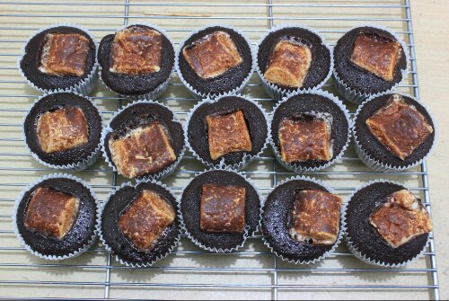 7. Scoop the batter onto each cup covering the marshmallow. In baking, the marshmallow will rise above the batter.