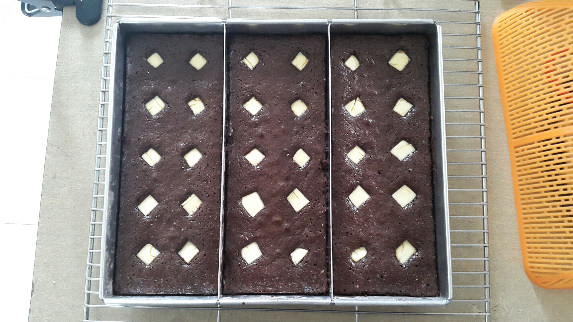 1. Panaskan oven di suhu 175 derajat celsius, siapkan 3 buah loyang brownies ukuran 25 x 10 x 4, olesi dengan mentega lalu beri alas kertas baking.